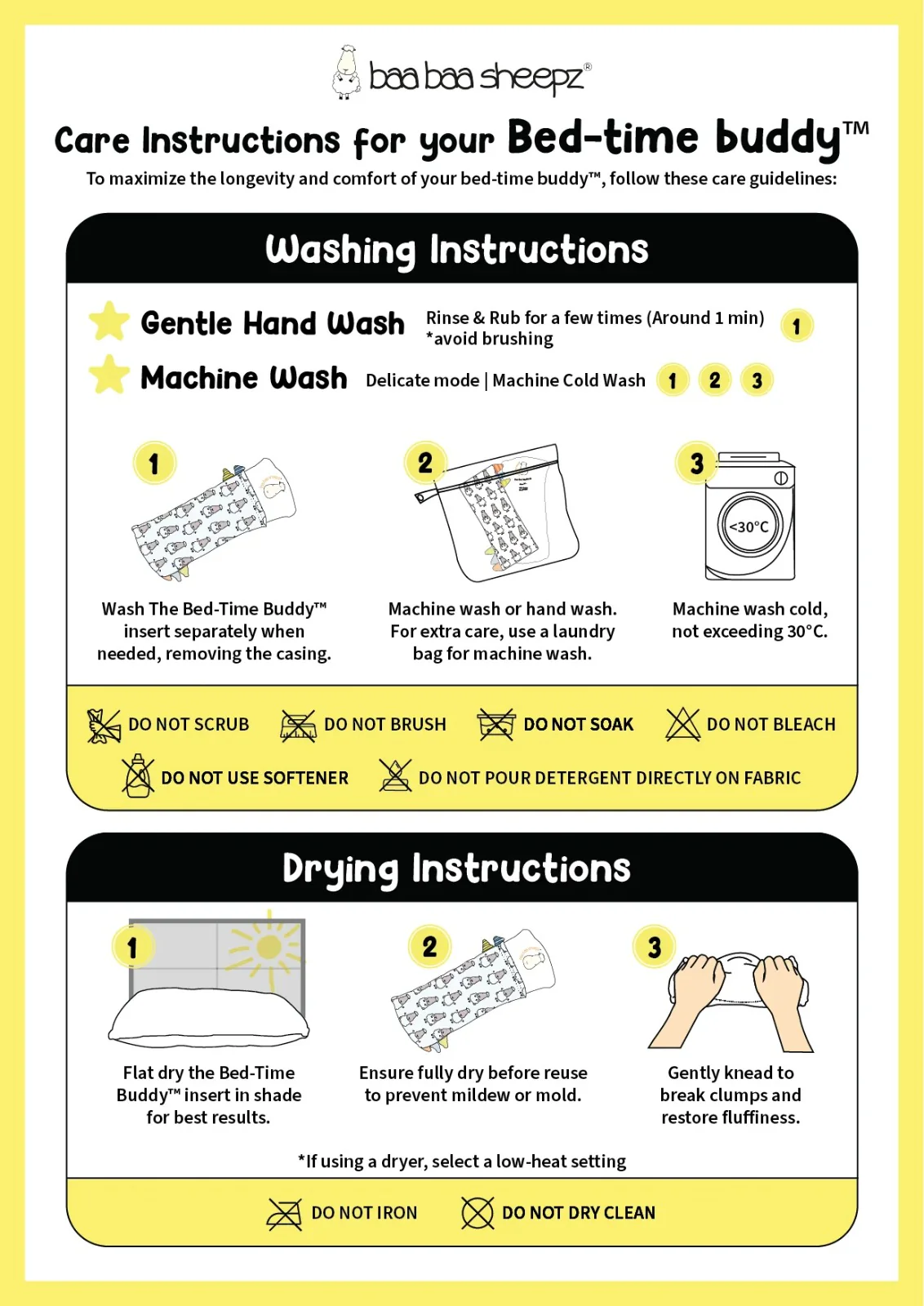 - Secara teratur,kibaskan bagian dalam Bed-Time Buddy untuk mencegah penggumpalan dan menjaga bentuk serta kelembutannya seiring waktu.